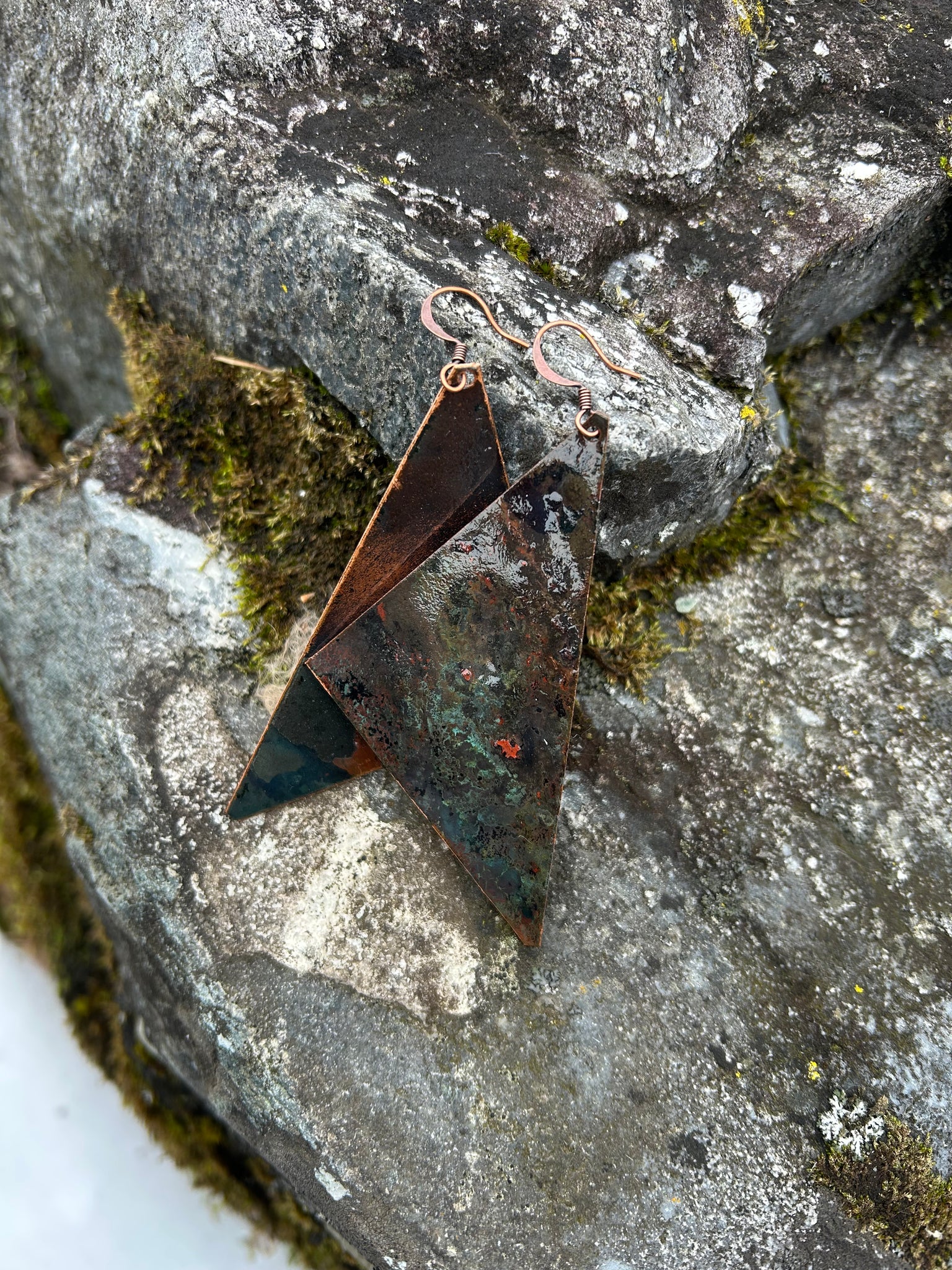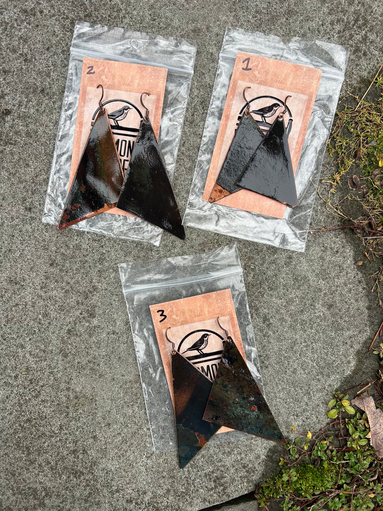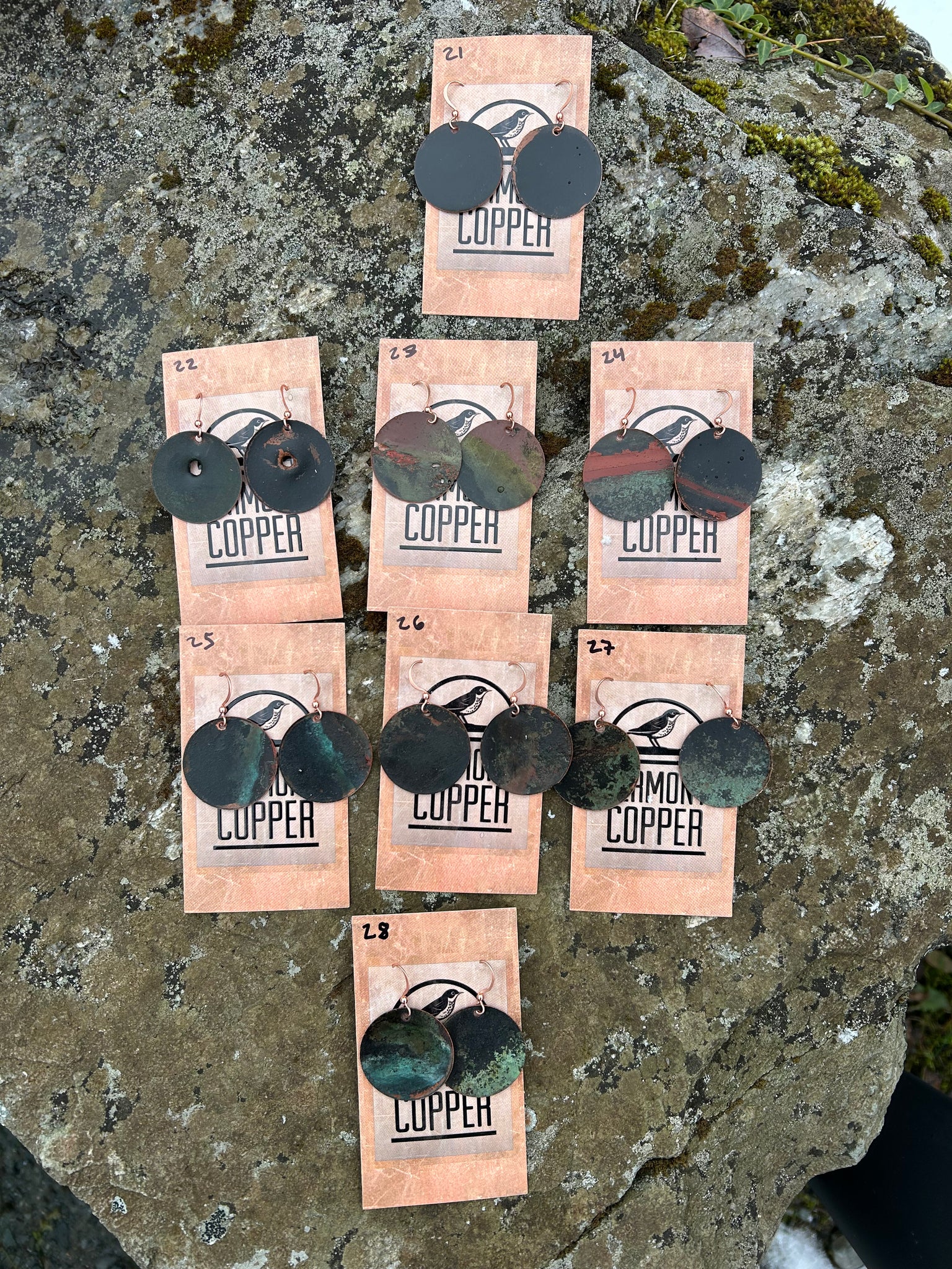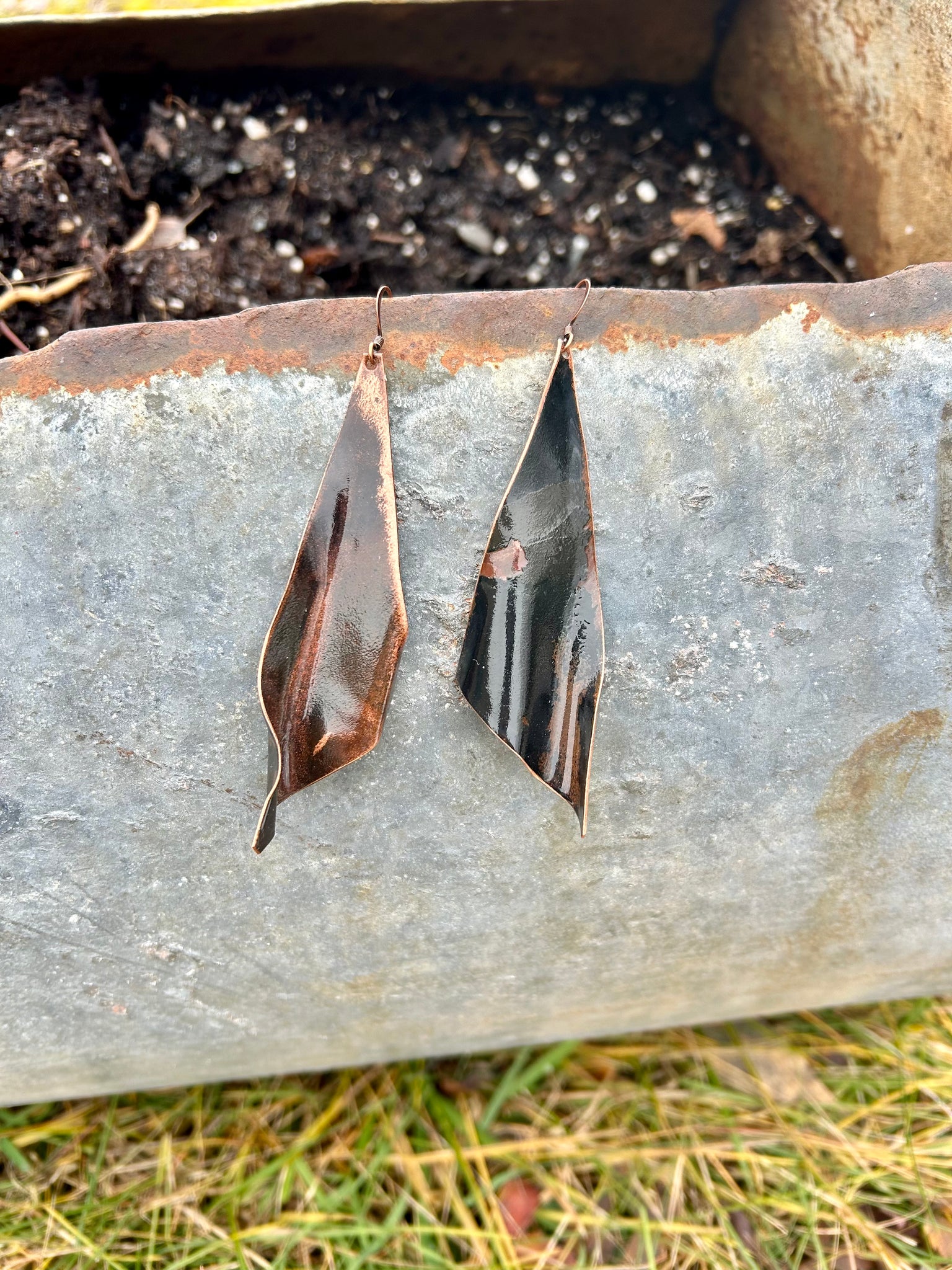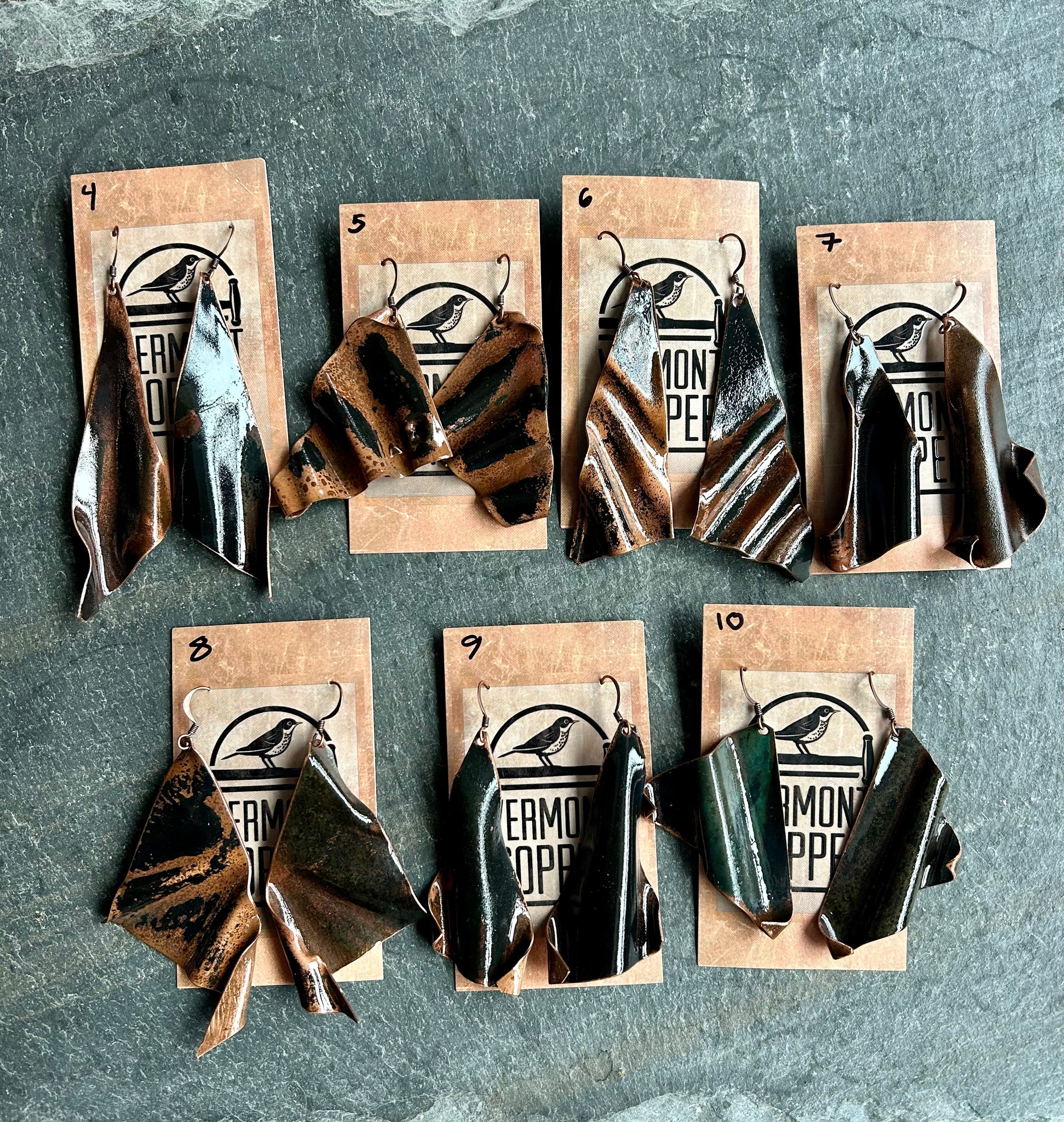 Our new collection of black earrings showcases a wavy or crimped look. There are various shapes and sizes in this collection. The copper used for these earrings is recycled from the metal taken off Fort Ethan Allen. The first 3 pairs are the largest between 2.5-3 in long. From 4-10 the sizing is around 2 in. And from 11-20, the size is between 1.5-2 in. Earrings 21-28 are disk earrings (1 in diameter). Enjoy your unique pair of earrings!!