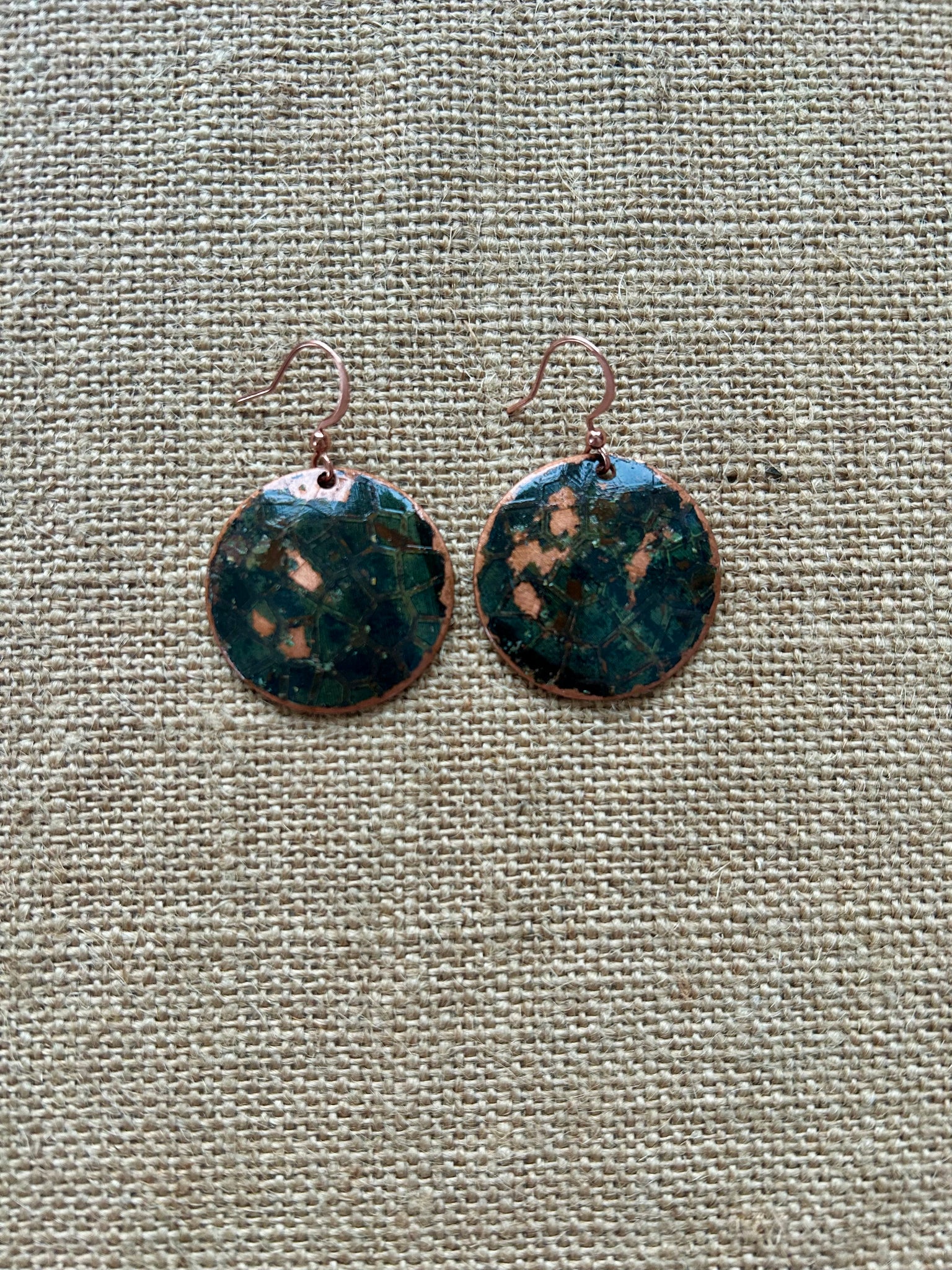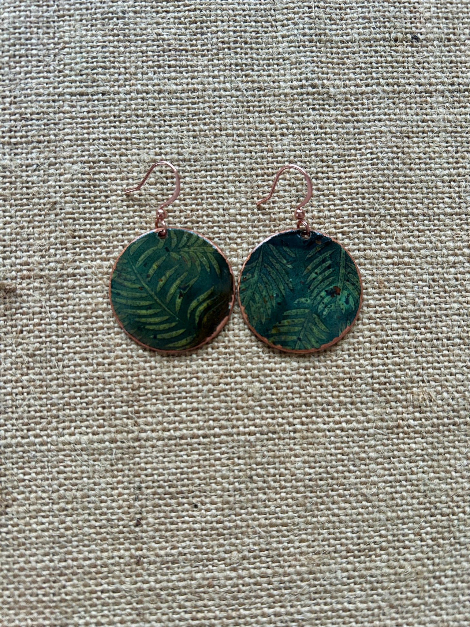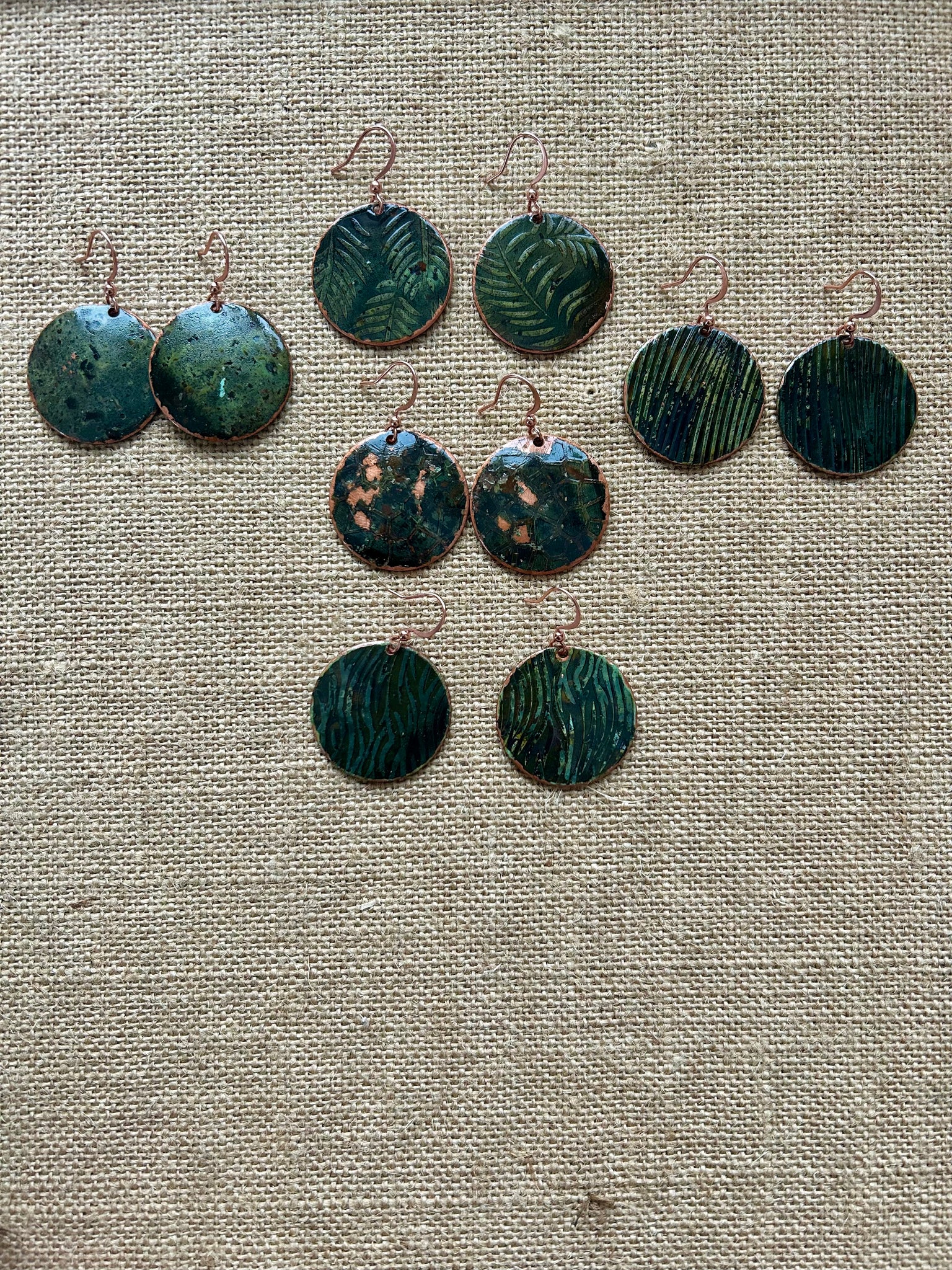 Using a plate roller with a particular design, like leaves or wavy lines, we were able to imprint the design onto our earrings and add a patina over it. These Dark Green Earrings are 1 of 5 different colors with this plate roller design. Hope you enjoy the designs of these earrings in any of our color options!